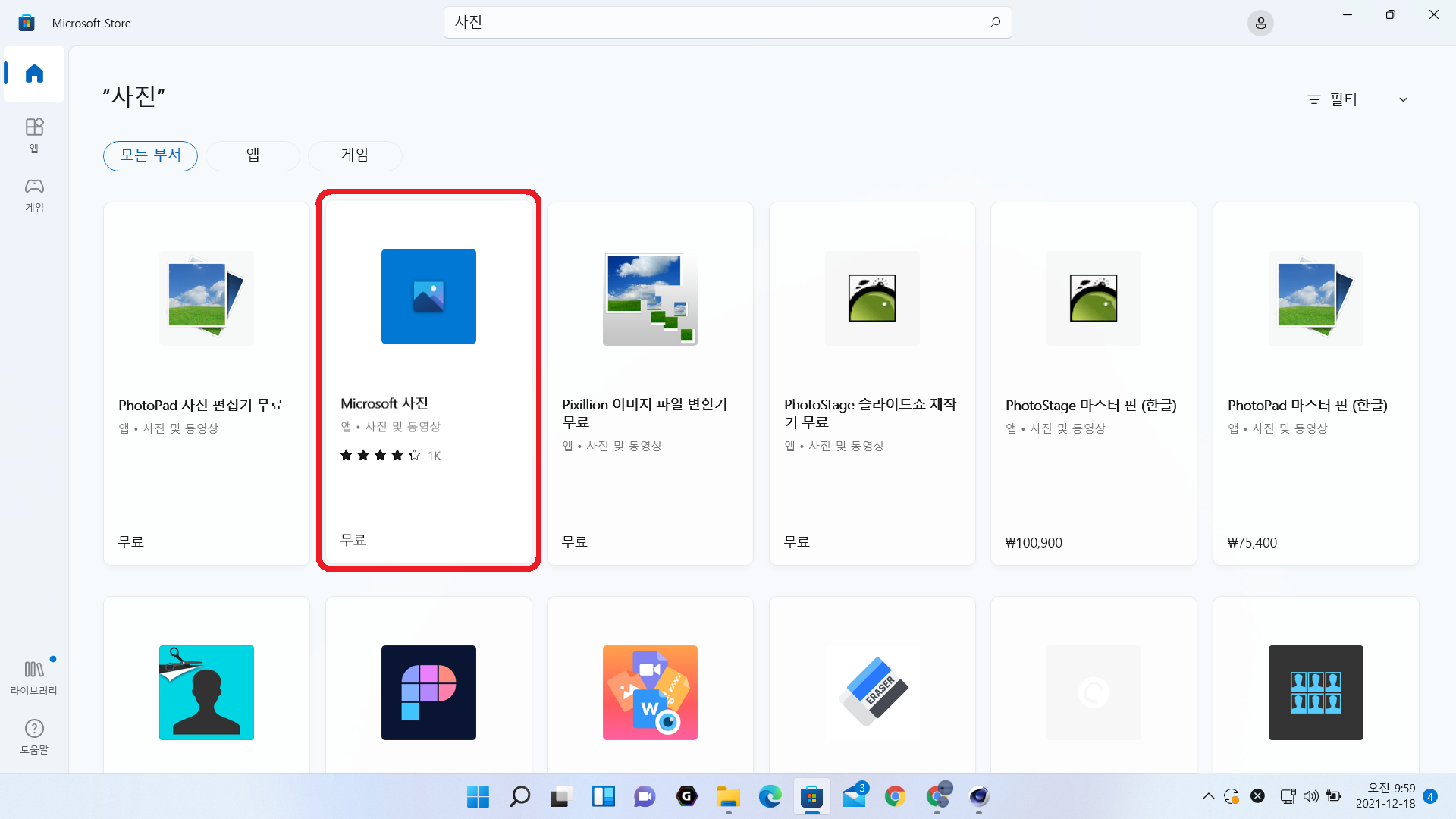 마지막으로 Microsoft Store 를 실행하고 '사진앱'을 검색하여 재설치 합니다.