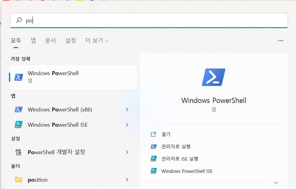 먼저 윈도우 검색에서 Windows Powershell을 찾아 관리자 권한으로 실행해 줍니다.